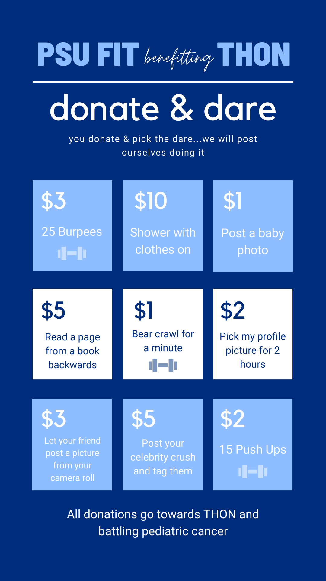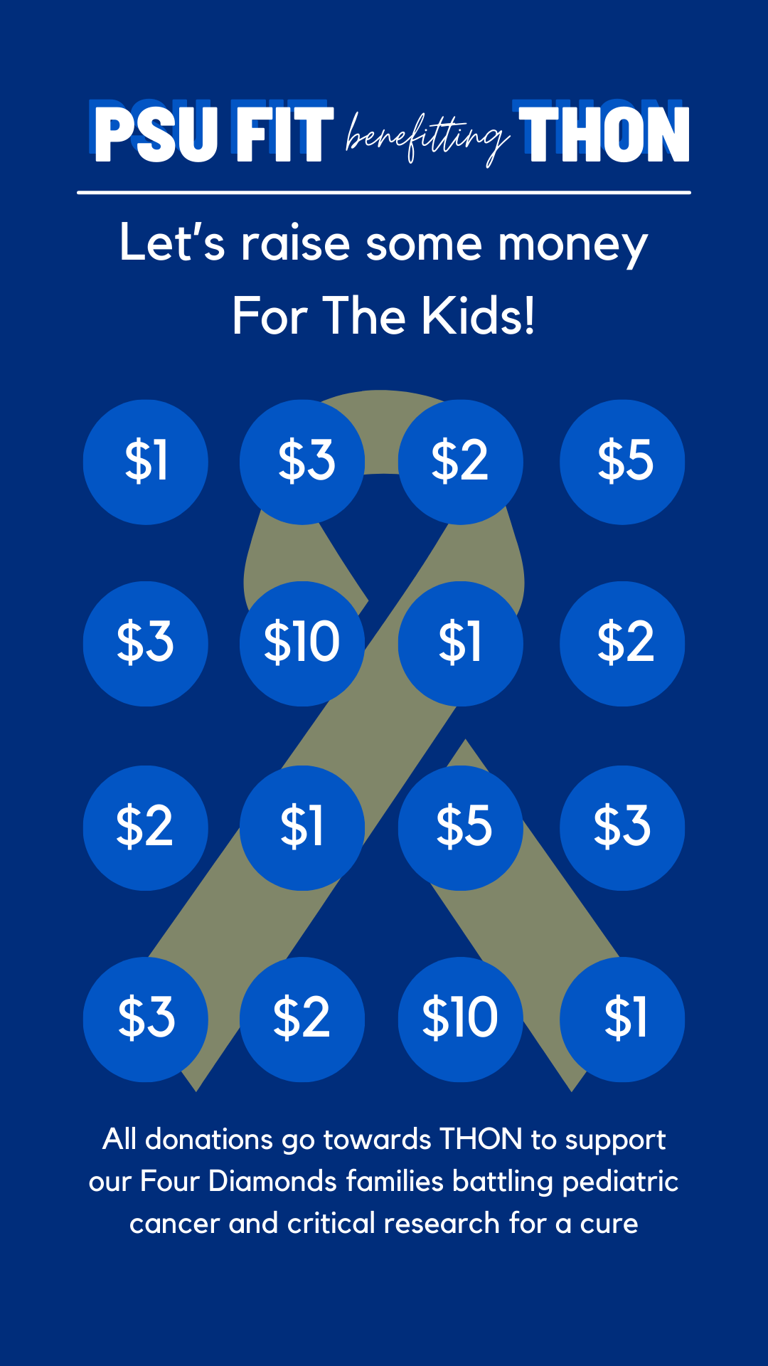 Penn State THON is a 46-hour no sit no sleep dance marathon raising money and awareness for pediatric cancer. All donations from THON support the Four Diamonds Foundation and Penn State Health Children’s Hospital. I served as the Online Fundraising Chair for Penn State Fitness to raise money for the organization and dance myself. I worked alongside a small team to coordinate and teach donation based fitness classes as well as lead all online fundraising efforts which included creating an Instagram page to promote awareness, designing a logo, making marketing graphics, designing merchandise, and other online fundraising materials. During this time I also managed the Instagram account using a posting schedule to time fundraising against broader THON fundraising pushes, THON events and Penn State Fitness specific programming.